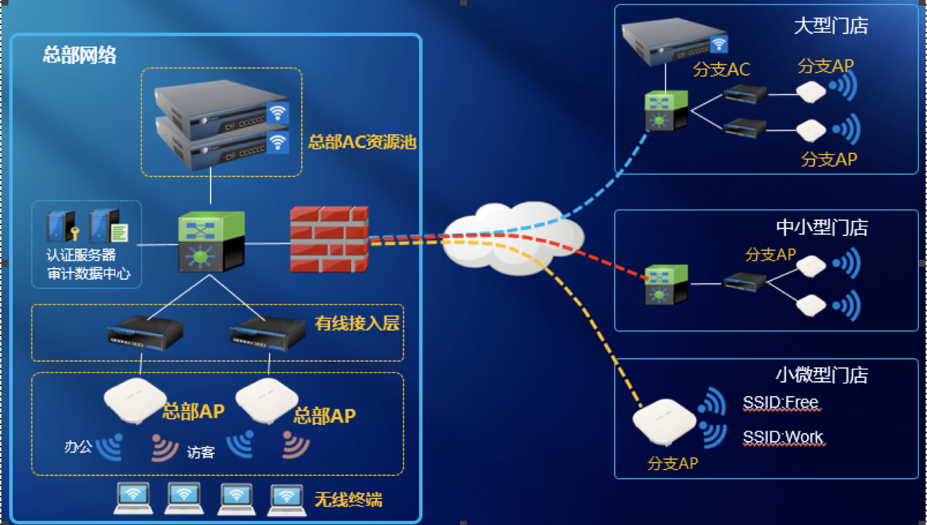 3、商场办公、顾客上网相互隔离,内外网使用不同的认证方式并分配不同的访问权限。