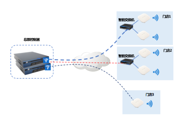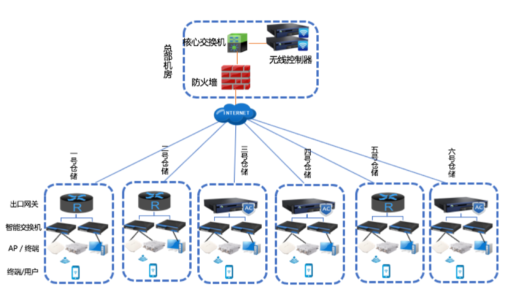 中心机房部署两台高性能控制器,中心机房实现双机冗余备份,统一管理全国仓库的无线AP,提高网络的可靠性。