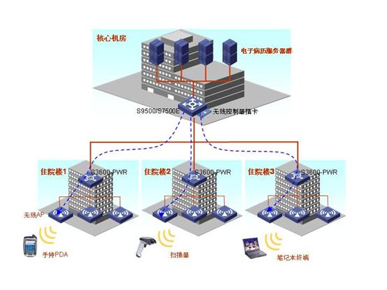 H3C为了满足医院的需要,结合当前的先进技术,提出了“无线查房――H3C有线无线一体化解决方案”。所谓“有线无线一体化”就是在核心交换设备(如