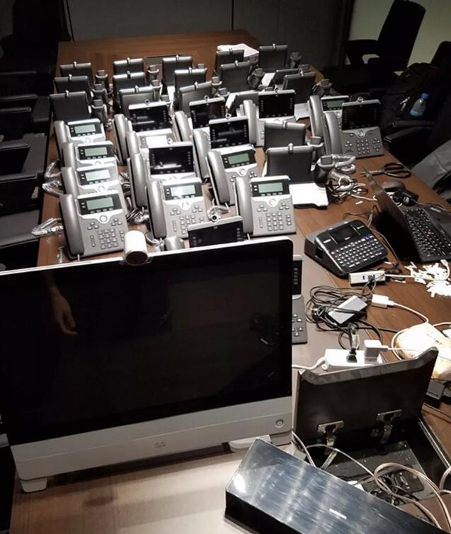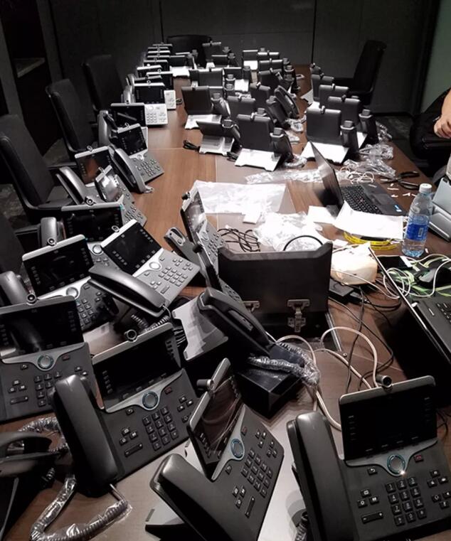 普通员工采用的是思科7821-k9型号的IP电话,数量在300套左右,支持两条线路按键。经理及总裁办公室采用的是思科8845-K9视频电话,集成了5K彩屏,具有视频功能。会议室采用的是思科8831音频会议电话,这是专为会议室场景设计的电话,拥有高保真音质、全向拾音、无线麦克风等功能。