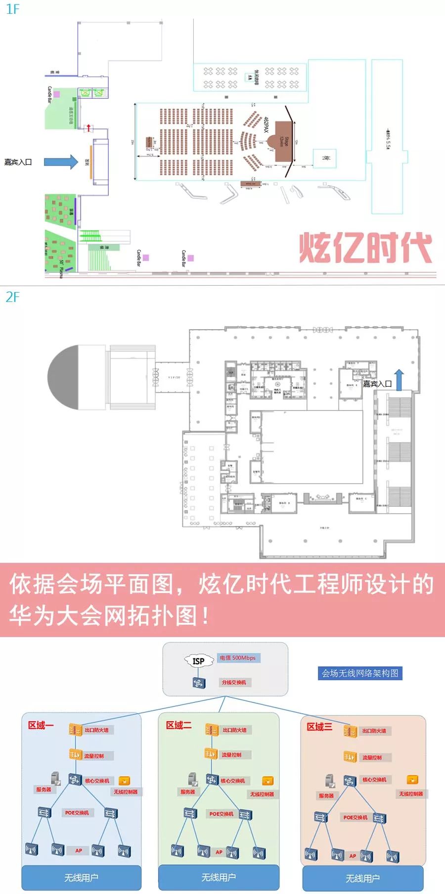 大会在北京华为会展中心举办,会场面积高达1万平米,分为上下2层。由于活动区域较为分散, 乐玩LEWIN时代 工程师和主办方多次沟通需求后,依据现场平面图为此次大会设计的拓扑图如下: