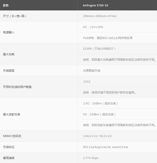 AirEngine 5760-10是华为发布的支持Wi-Fi 6(802.11ax)标准的无线接入点产品。支持2×2 MIMO,2.4GHz和5GHz双频同时提供业务,整机速率可达1.774Gbps。内置智能天线,信号随用户而动,带来更好的覆盖效果。适合部署在中小型企业、咖啡厅、休闲中心等场景。