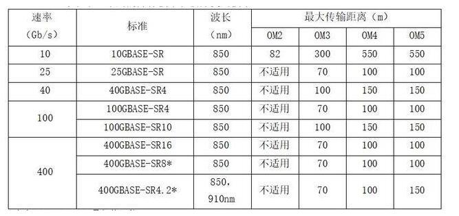 根据 IEEE 802.3系列以太网标准,OM2~OM5光纤在10G~400G系统的传输距离见表1。在40G、100G、400G系统中,采用的并行技术和波分复用技术。