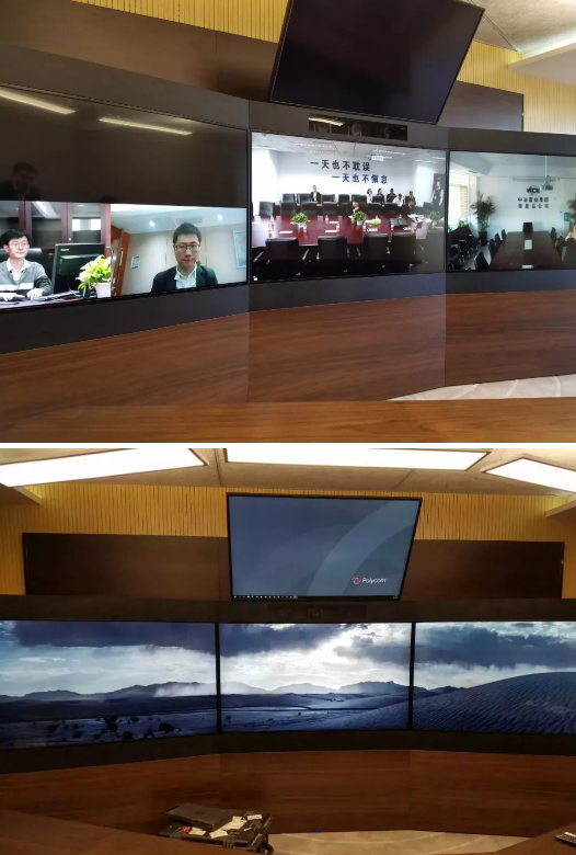 考虑到适配性和统一性,在分公司会议室采用的是同样的终端系统,都是采用宝利通500视频会议终端、宝利通模拟电话终端、鸿合ICB-X6交互一体机以及三星双显屏幕。