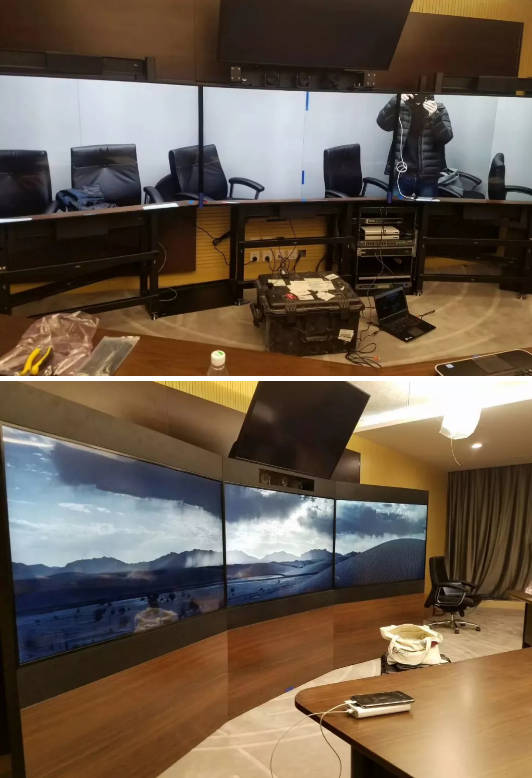 这两个会议室规模相似且处于同一楼层,所以建设方式大体相同,为了成本考虑,在某些地方有所改变。两间都是采用的宝利通550视频会议终端及宝利通电话终端,以及其他的音、视频系统,数字系统等等。不同地方在于,其中较小的一个会议室配备了投影仪和交互一体机,较大那个采用的是55寸3*3的拼接屏。