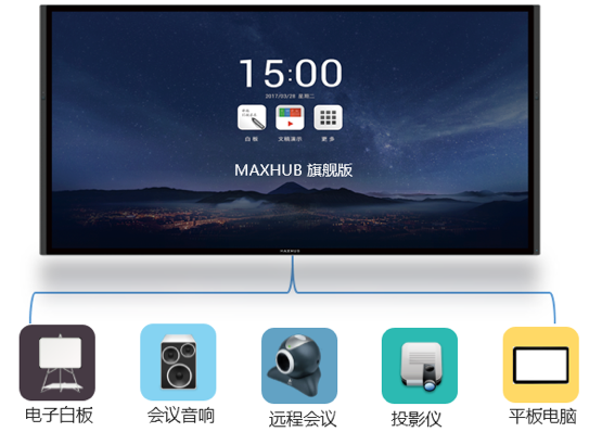 MAXHUB包涵电子白板、无线传屏、远程会议、4K高清显示、会议内容扫码带走; 投影仪、音响、白板、摄像头四合一,让会议设备更加精简;远程会议中实现主会场、分会场视频、语音、演讲内容、白板书写远程交互;第三方设备搭配兼容性强,可以与客户现有产品进行搭配。